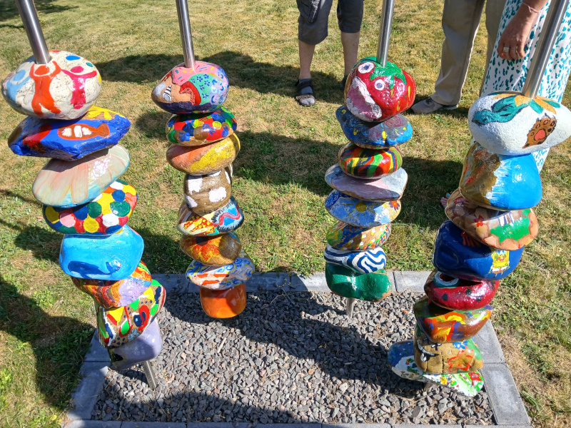 Durch den Förderverein war mittlerweile auch das notwendige Podest im Garten der Einrichtung fertiggestellt worden, so dass am 2.7. im Beisein aller Beteiligten die bunten Ergebnisse auch präsentiert werden konnten. Das Rätselraten unter den Bewohnern welchen Zweck die blanken Stahlstangen hatten war somit gelöst.